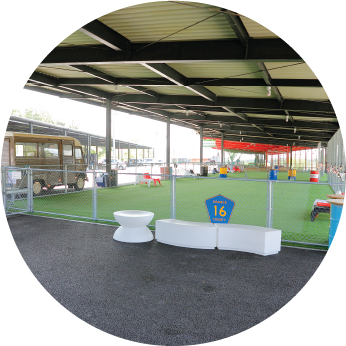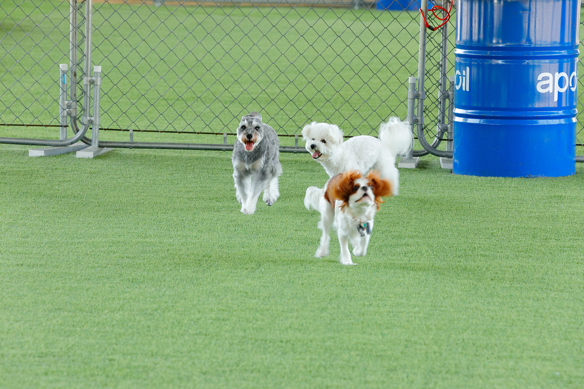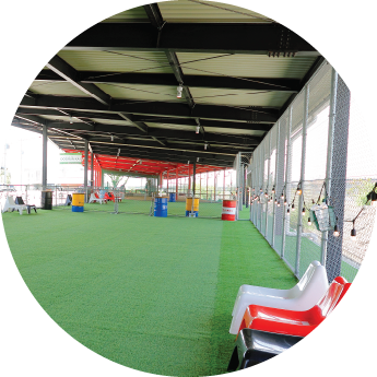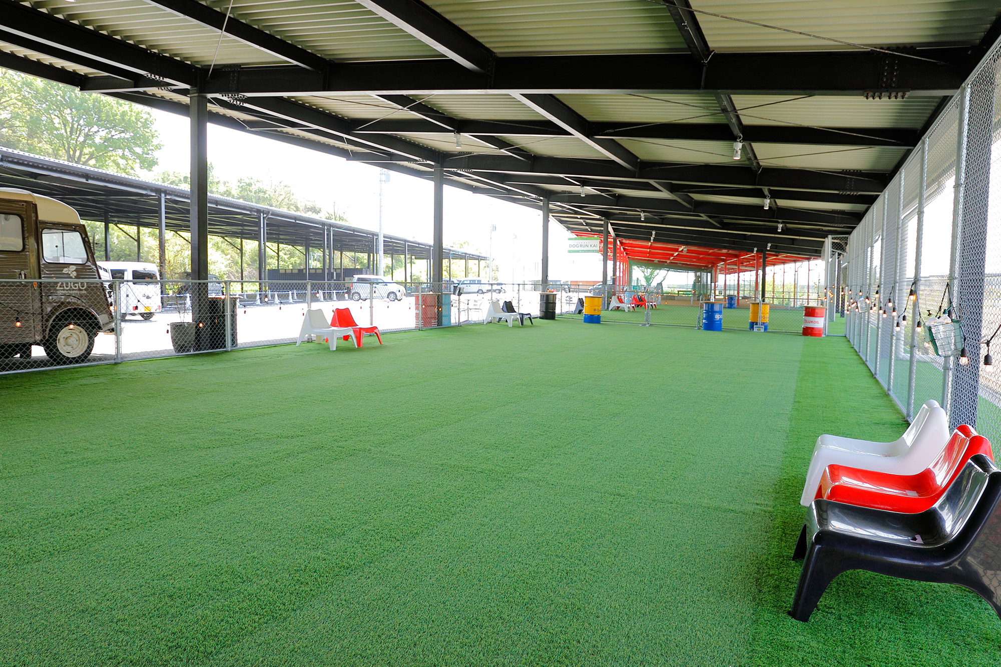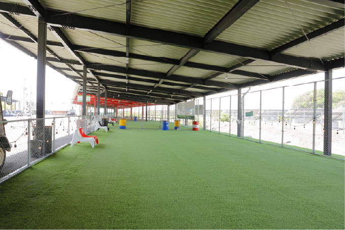天候の影響を受けにくい屋根付き人工芝ドッグランで、